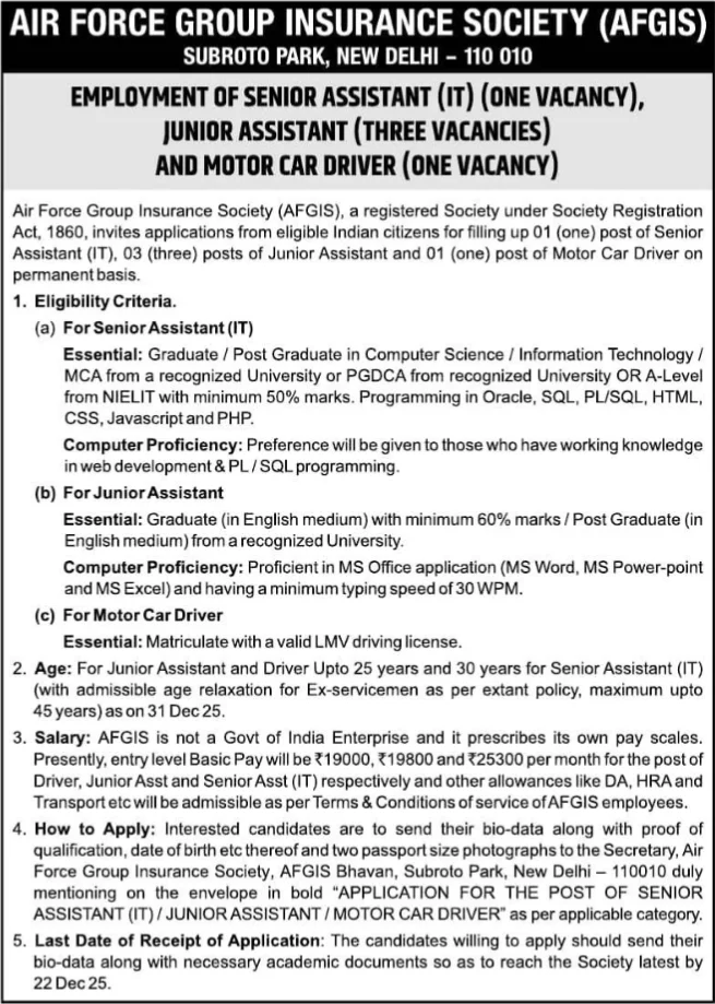 AFGIS Recruitment 2025: The Air Force Group Insurance Society (AFGIS) has released the latest recruitment notification for the posts of Junior Assistant, Sr Assistant and Motor Car Driver. The offline …