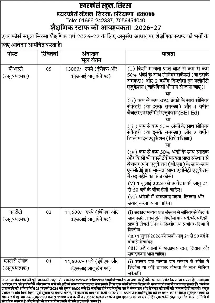 Air Force School Sirsa Recruitment 2026: The Air Force School Sirsa Haryana invites offline application forms for various posts Include PRT, NTT, NTT Music Teacher. These posts are purely on contract or contractual basis. Interested candidates can apply by submitting their application form through post. All details related to Air Force School Sirsa Recruitment 2026 are given below in this post. You can also check all details related to Air Force School Sirsa Vacancy 2026 on the official website of https://airforceschoolsirsa.in/.