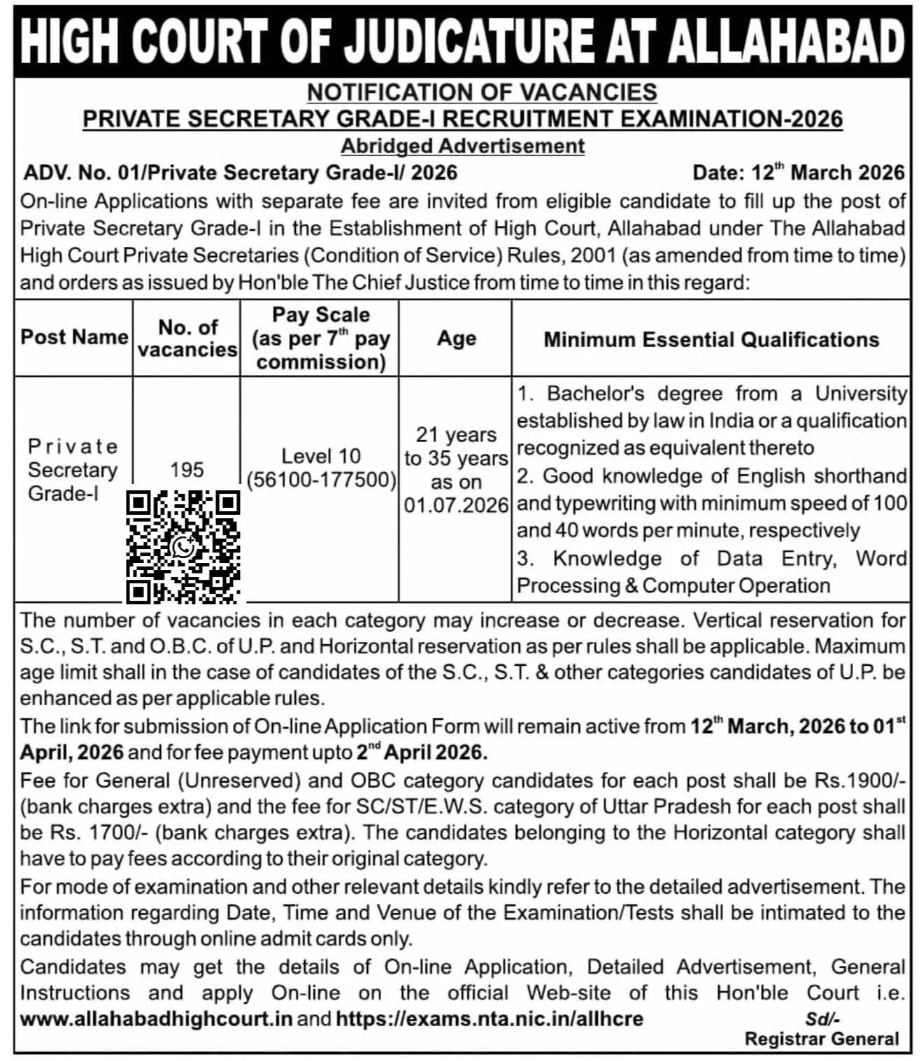 Allahabad High Court Private Secretary Recruitment 2026: The Detailed essential information regarding the application process. You can gain an understanding of the eligibility criteria, selection procedure, application form, and important dates for this recruitment drive.