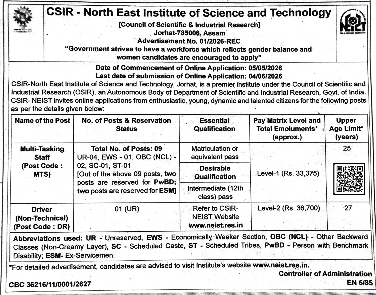 CSIR- NEIST Recruitment 2026: CSIR-NEIST Recruitment 2026 notification has been officially released for Multitasking Staff (MTS) and Driver posts. A total of 10 vacancies have been announced under this recruitment drive, offering a good opportunity for candidates seeking government jobs.