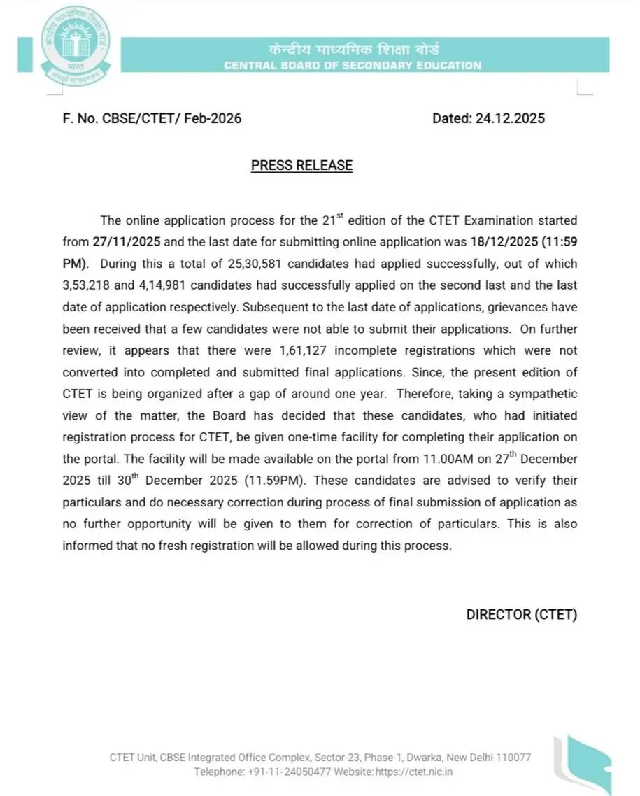 The CTET 2025 Notification has been released on 24 October 2025. All the details of the CTET 2025 exam, like Notification PDF, Apply Online Link, Application Fee, Exam Date, Exam Pattern, Syllabus, etc., are given here.