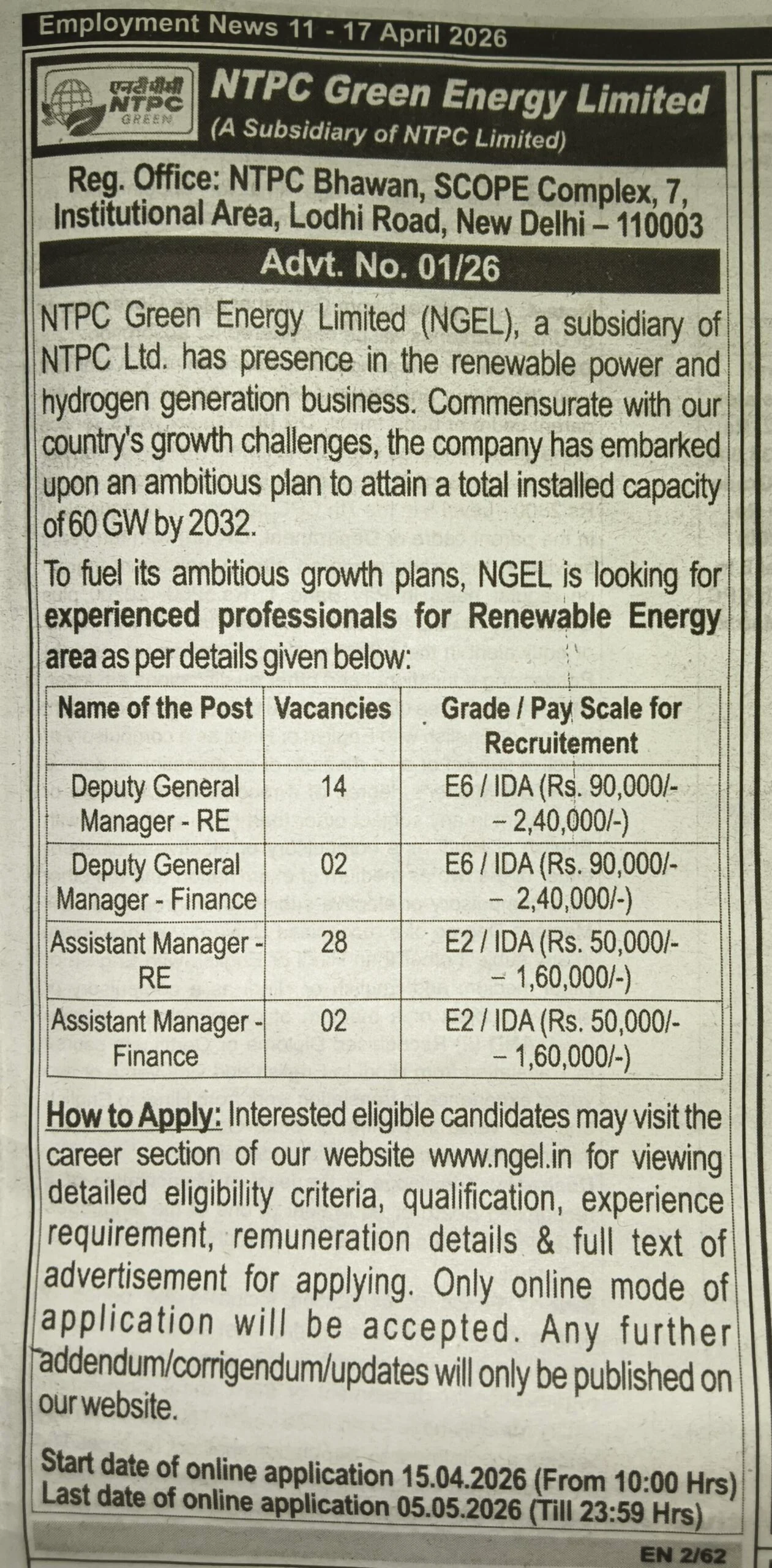 Delhi NGEL Recruitment 2026: NTPC Green Energy Limited (NGEL), a subsidiary of NTPC Limited, has released a major recruitment notification for 2026 under Advt. No. 01/2026. A total of 46 vacancies are open for Assistant Manager and Deputy Manager positions across Renewable Energy and Finance disciplines. This is an excellent opportunity for professionals seeking a career in the rapidly growing renewable energy sector under a reputed government organization. Applications are accepted online only from 15 April 2026 to 5 May 2026 via the official portal: www.ngel.in.