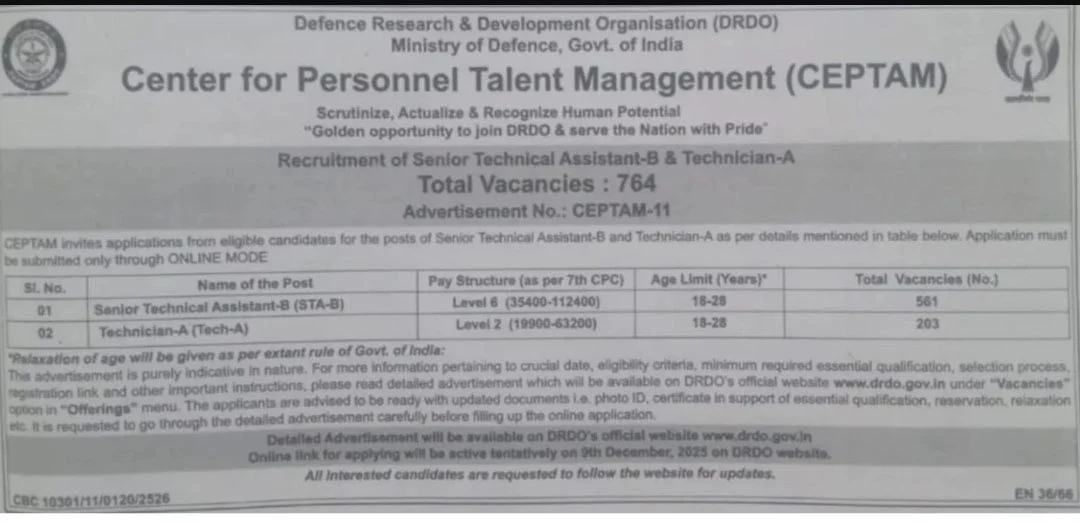 DRDO CEPTAM 11 Recruitment 2025: The Defence Research & Development Organisation has released the latest notification and invited the online applications for the recruitment of 764 Senior Technical Assistant-B, Technician-A Posts. Eligible candidates can apply online for the DRDO CEPTAM 11 Vacancy 2025 from the website https://www.drdo.gov.in/ All the details related to DRDO CEPTAM 11 Recruitment 2025 are given below