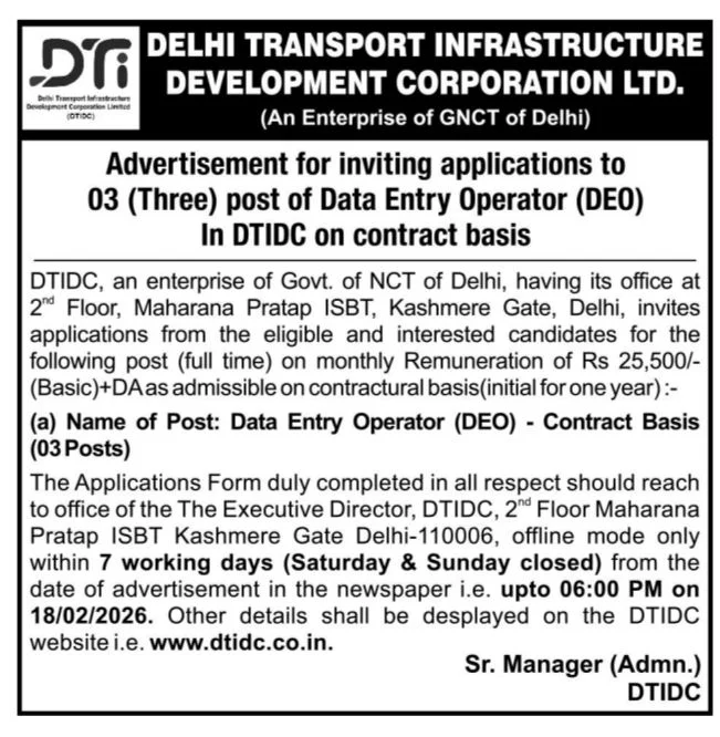 DTIDC DEO Recruitment 2026: The Delhi Transport Infrastructure Development Corporation (DTIDC) has released the latest notification for the recruitment of Data Entry Operator (DEO) Posts. Eligible candidates can apply offline for DTIDC DEO Vacancy 2026 starting from 09 February 2026. All the details related to DTIDC ClerkBharti 2025 are given below.