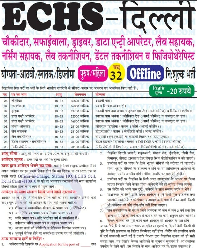 ECHS Delhi Vacancy 2025: The Ex-Servicemen Contributory Health Scheme Delhi has recently issued a notification to hire for various 32 vacancies Offline Form which include Clerk, Driver, and Others positions For All India Candidates. Eligible Indian male and female candidates can send their applications for ECHS Delhi Vacancy 2025 offline form ECHS Official website echs.gov.in from 20 August 2025. All the information related to ECHS Delhi Bharti 2025 is given below.