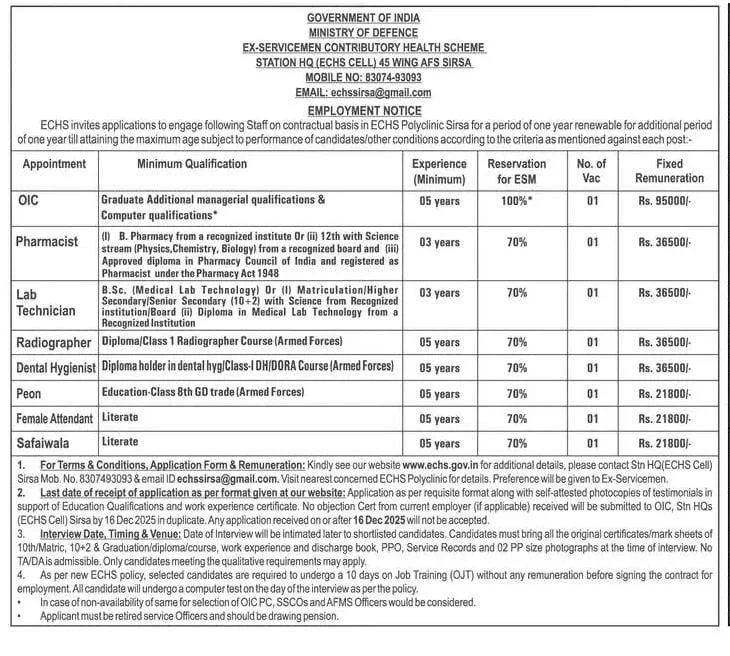 ECHS Sirsa Recruitment 2025 Notification And Application Form: Ex-serviceman Contributory Health Scheme (ECHS) Sirsa has recently announced a recruitment notification for various non-teaching posts offline form. This notification dated 20 November 2025, presents exciting opportunities for eligible candidates to join the ECHS Sirsa Staff. Interested persons can easily apply offline for the ECHS Sirsa Vacancy 2025 through the official website echs.gov.in, the application process starts on 20 November 2025.