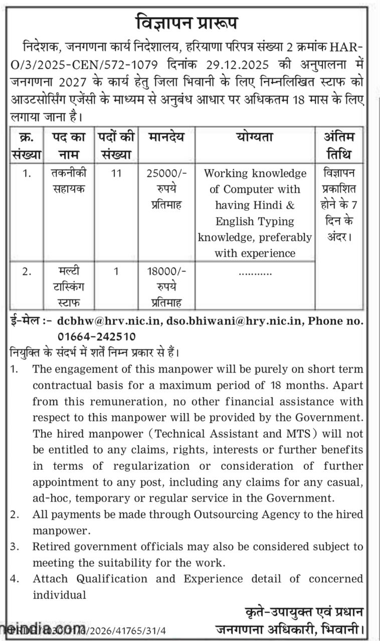 Haryana Census Department Recruitment 2026: The Haryana Census Operations Directorate, BHIWANI has released the latest notification for the recruitment of 12 Posts of Technical Assistant & MTS under Contract/Regular Basis Posts online Form For All India Candidates. Eligible candidates can apply online for the Haryana Census Department Recruitment 2026 starting from 06 January 2026. All the details related to Haryana Census Department Vacancy 2026 are provided below.
