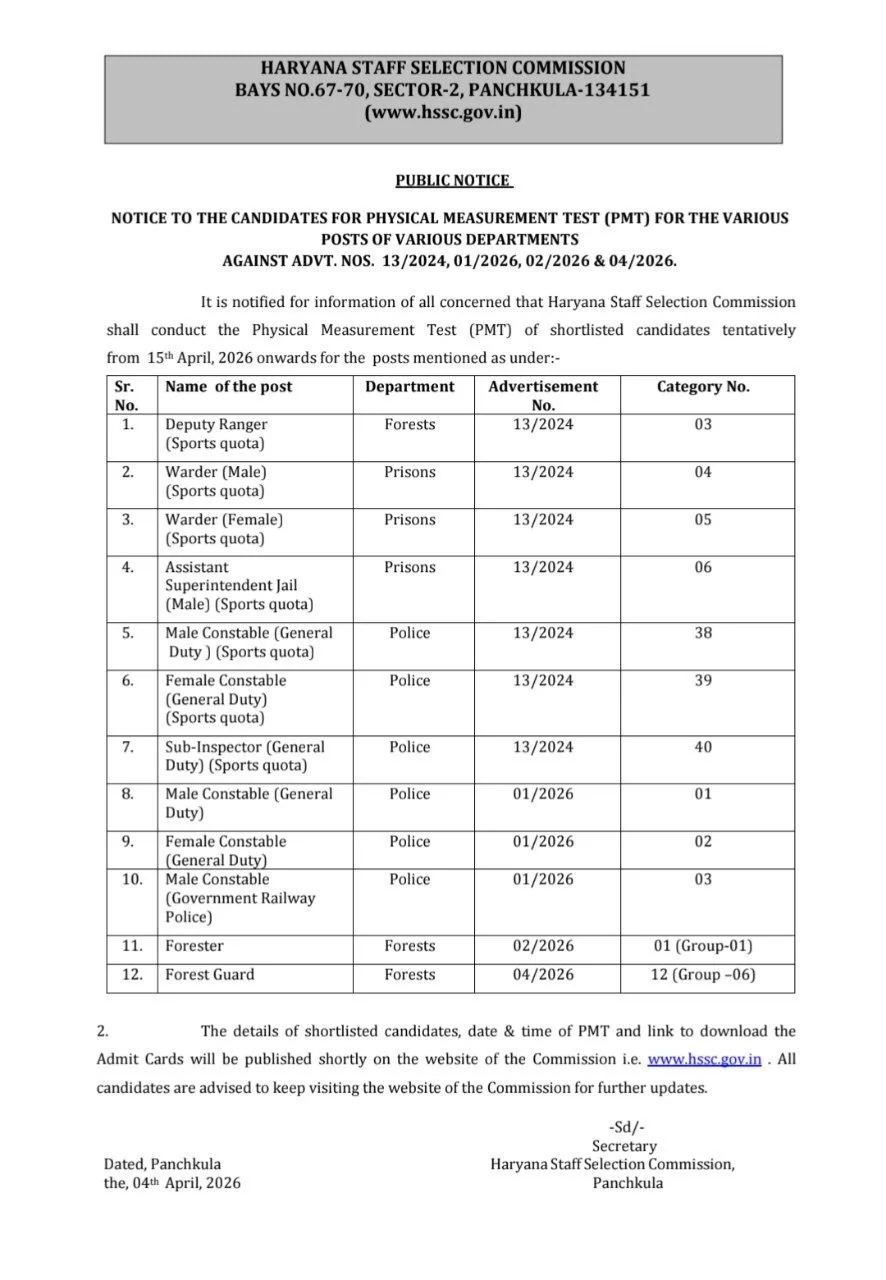 The Haryana Staff Selection Commission (HSSC) has released the Physical Test dates for Constable Recruitment 2026. The admit card will include important details such as the candidate’s name, roll number, exam date, reporting time, and test center.
