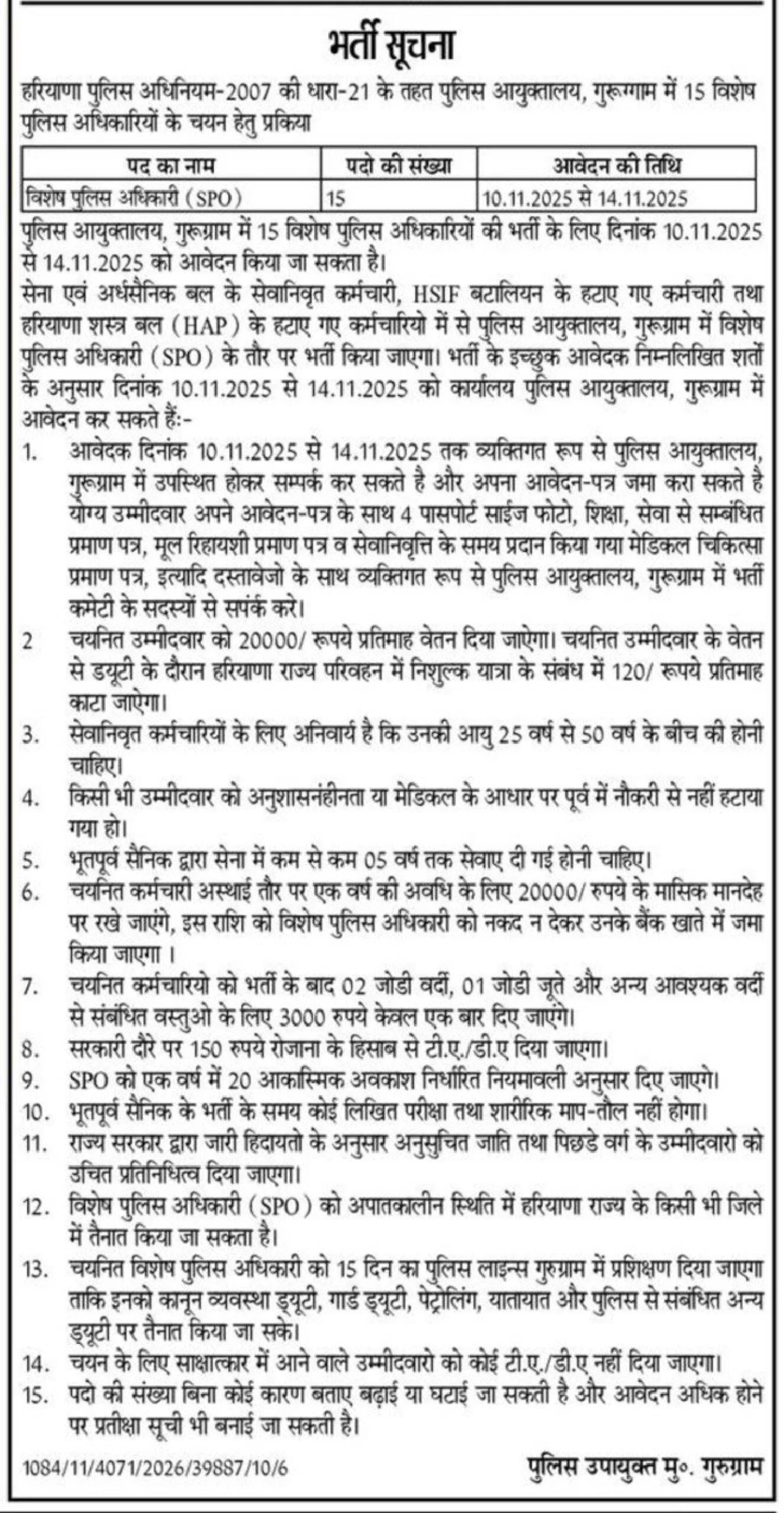 Haryana Police SPO Recruitment 2025 Notification And Application Form: Haryana Police Department, Gurgaon has released the latest recruitment notification for the recruitment of 15 SPO (Special Police Officer) for Gurgaon District. Haryana Police SPO Vacancy Notification 2025 has been released on 31 October 2025 and the offline applications are invited from 10 November 2025. The eligible and intersted candidates can go for walk in interview for the Haryana Police SPO Bharti 2025.