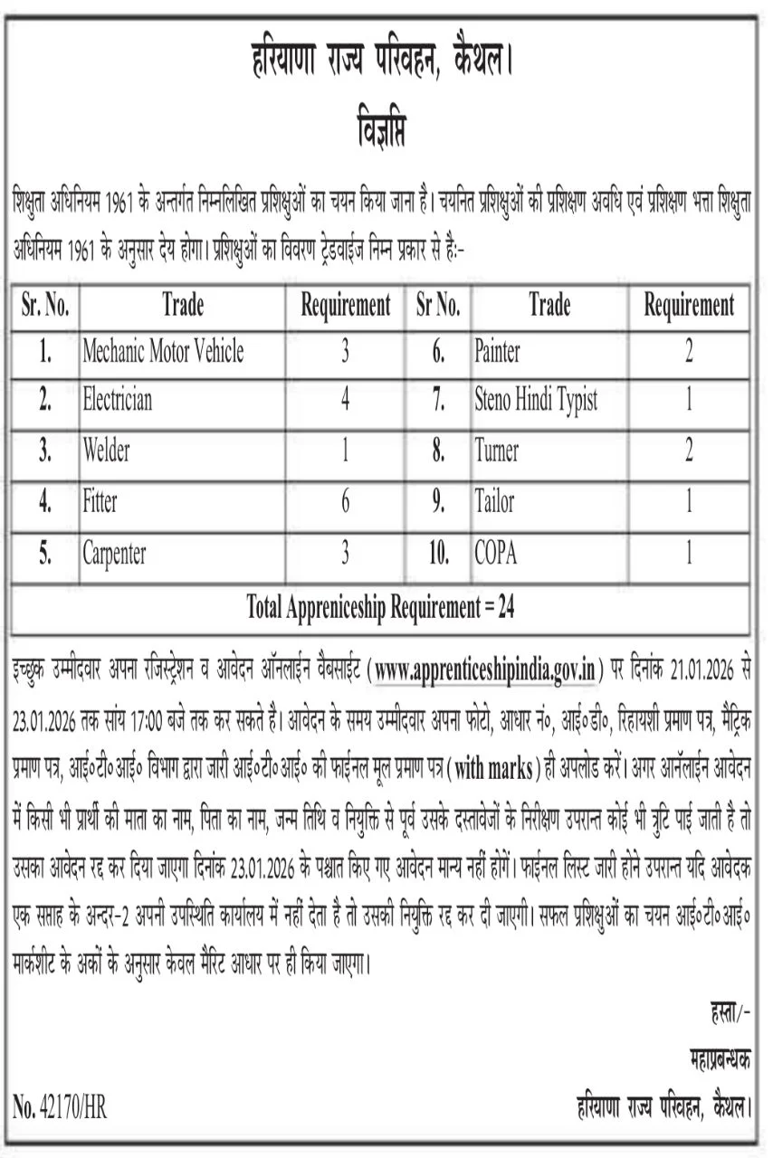 Haryana Roadways Kaithal Apprentice Recruitment 2026: The Detailed essential information regarding the application process. You can gain an understanding of the eligibility criteria, selection procedure, application form, and important dates for this recruitment drive.