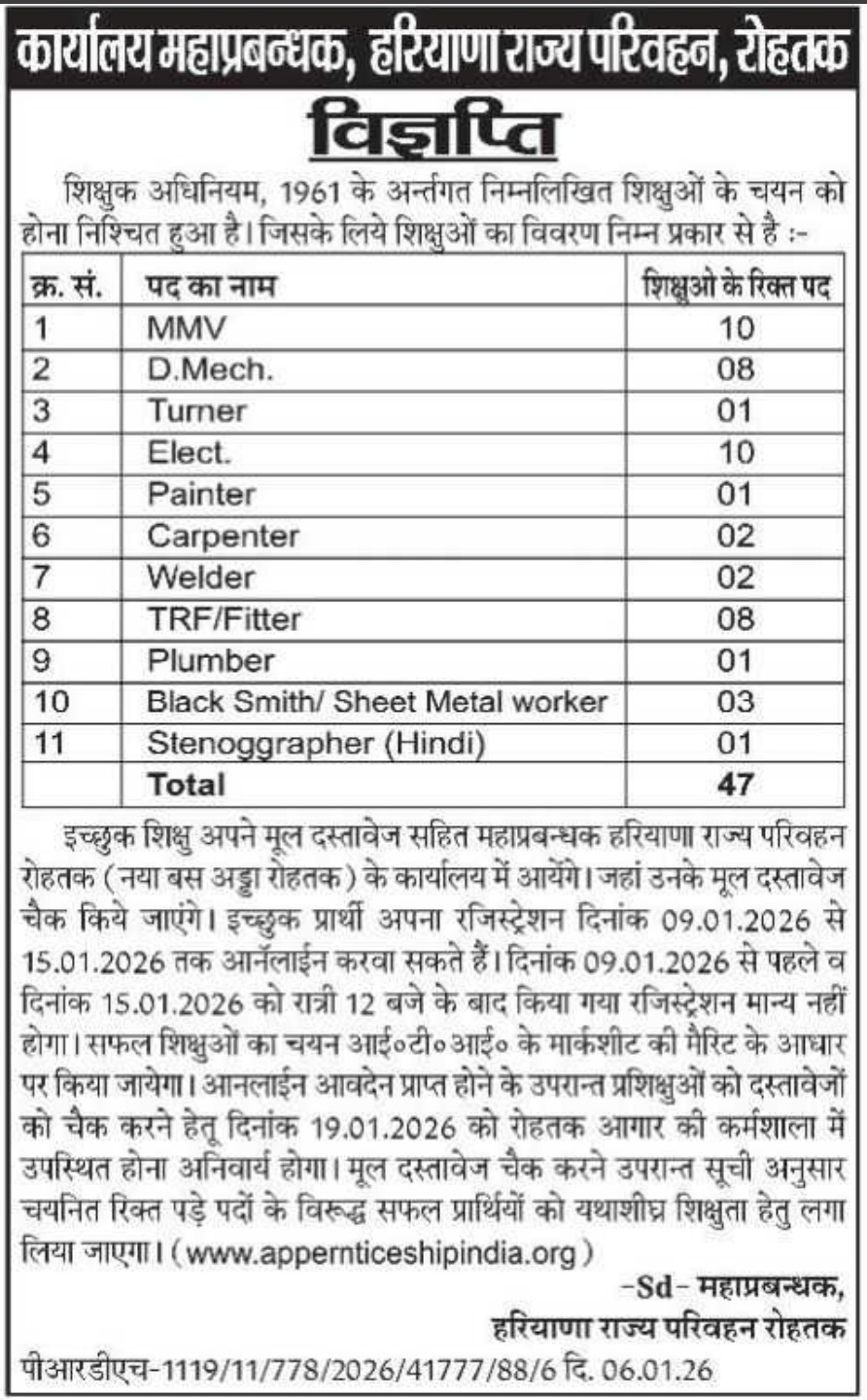 Haryana Roadways Rohtak Apprentice Recruitment 2026: The General Manager, Haryana Roadways, Rohtak Depot, has released a notification for ITI Trade Apprentice Online Form for 47 apprentice vacancies. Only candidates from Haryana can apply for this form. Interested and eligible candidates can fill out the online form from 09 January 2026.