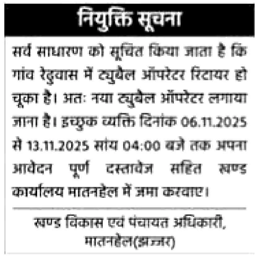 Haryana Tubewell Operator Recruitment 2025 Notice Overview