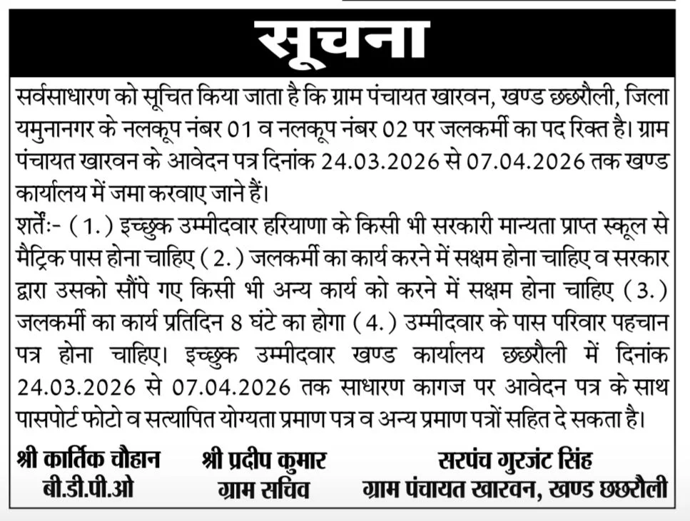 Haryana Tubewell Operator Recruitment 2026 Notice Overview