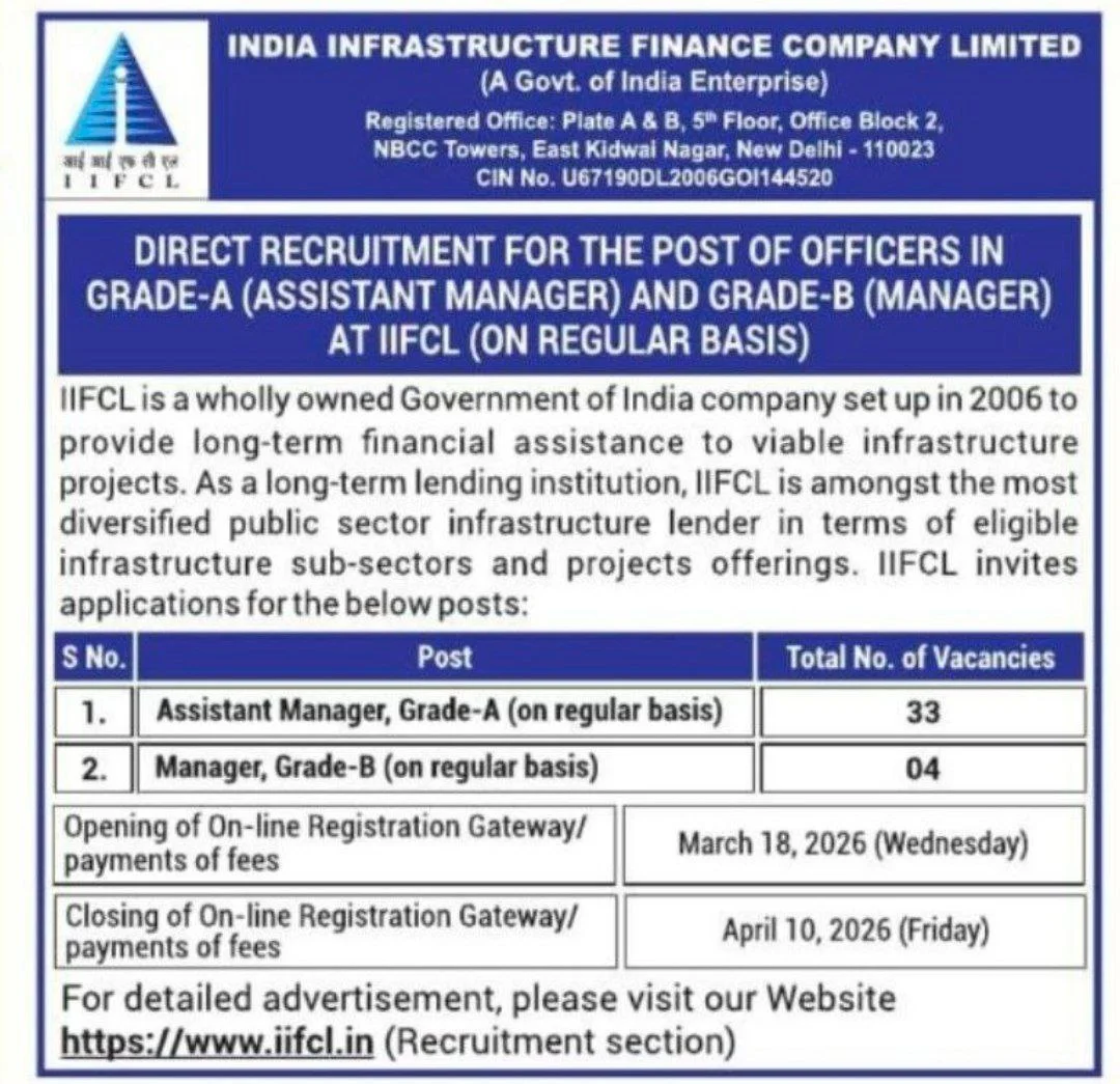 IIFCL Delhi Recruitment 2026: The India Infrastructure Finance Company Limited (IIFCL) has released an official notification for the recruitment of Grade-A (Assistant Manager) and Grade-B (Manager) posts on a regular basis. This is a great opportunity for candidates seeking a government job in the financial sector. The recruitment aims to fill 37 vacancies across different grades.