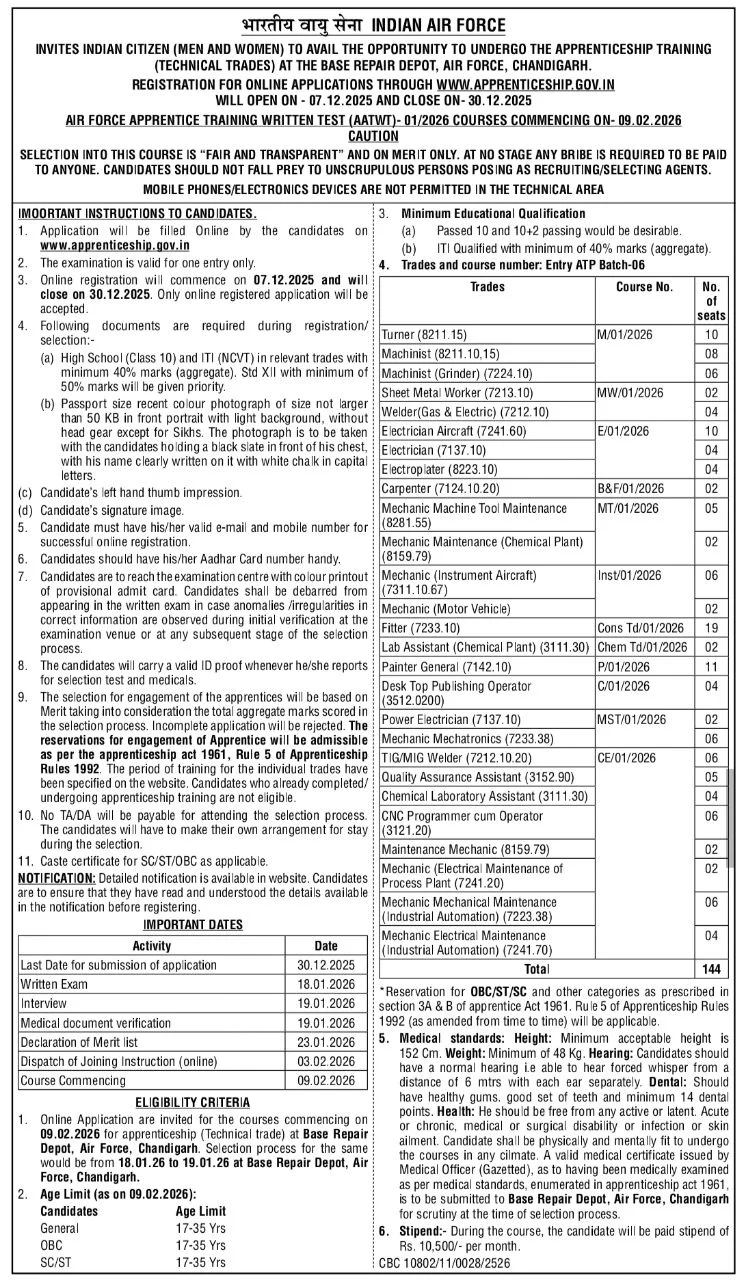 Indian Air Force Apprentice Recruitment 2025: The Indian Air Force has released the latest notification for the Apprenticeship Training (Technical Trades) at Base Repair Depot, Air Force, Chandigarh. Eligible Indian citizens (Men and Women) can apply online for various technical apprentice trades. The online registration through www.apprenticeship.gov.in will start on 07 December 2025 and will remain open till 30 December 2025. The selection will be done strictly on merit basis without any influence, and no bribe is required to be paid to anyone.