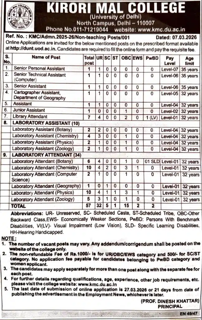 KMC Delhi Non-Teaching Recruitment 2026: The Kirori Mal College, under University of Delhi, has released the KMC Delhi Non-Teaching Recruitment 2026 notification for various administrative and support staff posts. Eligible candidates can apply online through the official recruitment portal.