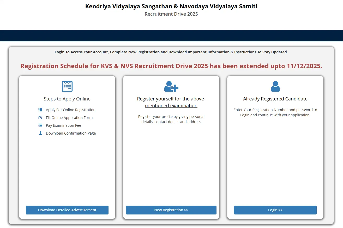 Candidates are advised to carefully read the official notification available on the KVS, NVS, and CBSE websites before applying. The online application process will start from 14 November 2025, and the last date to submit the application form is 04 December 2025.