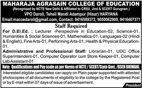Maharaja Agrasain College Of Education, Hisar Recruitment 2026: The Maharaja Agrasain College Of Education, Tehsil Mandi Adampur, Hisar, affiliated with CRSU, Jind & SCERT Gurugram, …