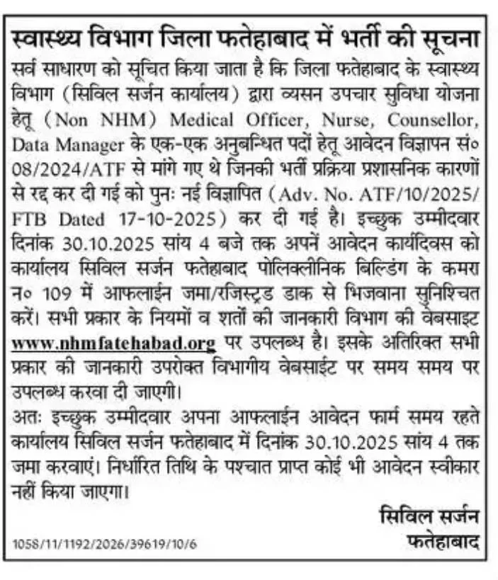 - Send The Application Form To The Address “Applications will be accepted in office of Civil Surgeon, Fatehabad by registered post/courier only up to 30 October 2025 before 4:00 P.M.”
