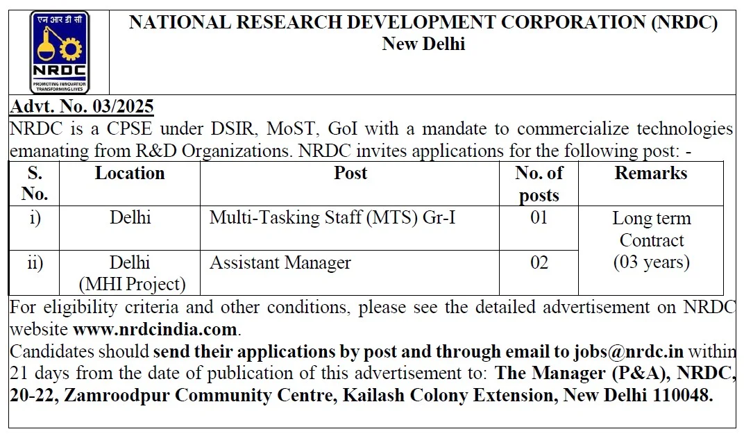 NRDC India Recruitment 2025: The National Research Development Corporation New Delhi has released the latest notification for the recruitment of Multi Tasking Staff (MTS) Posts. Eligible candidates can apply offline for NRDC India Vacancy 2025 starting from 10 November 2025. All the details related to NRDC India Bharti 2025 are given below.