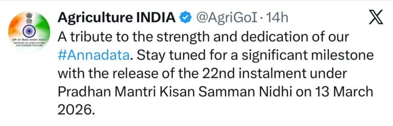 The 22th installment of the PM Kisan Yojana will be released on March 13, 2026, at 12:30 PM.