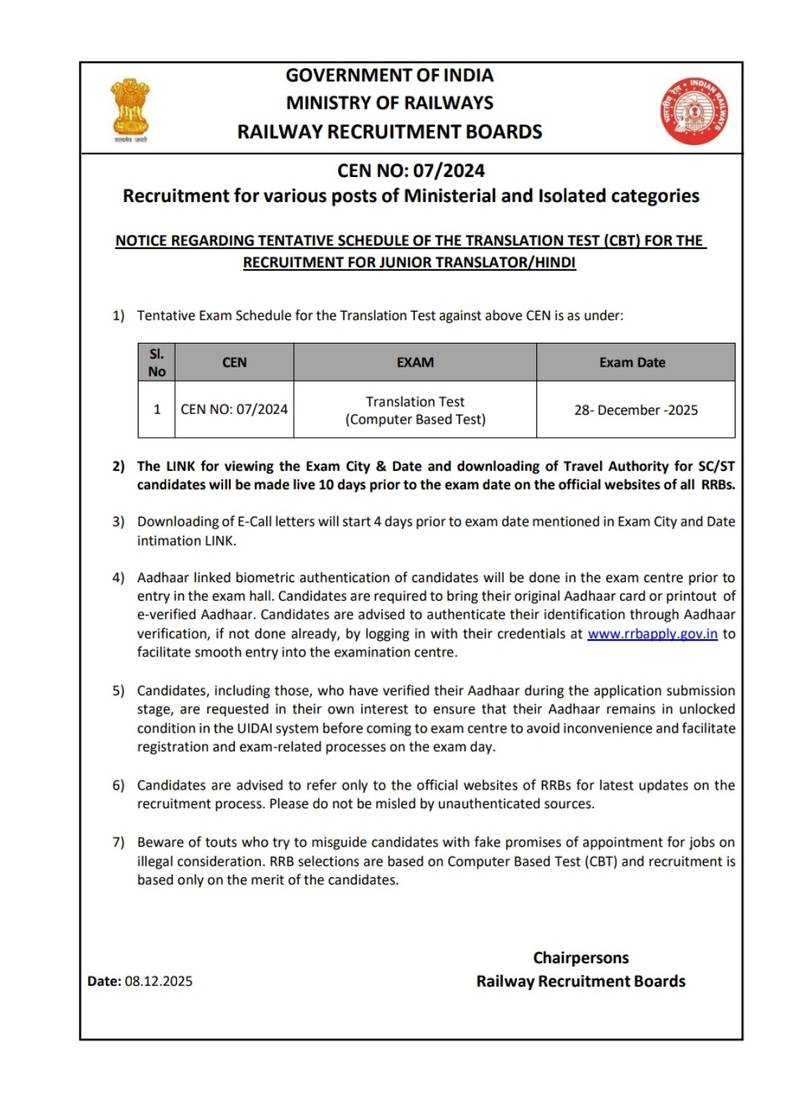 | RRB Ministerial and Isolated Translation Test Date Notice | Notice |